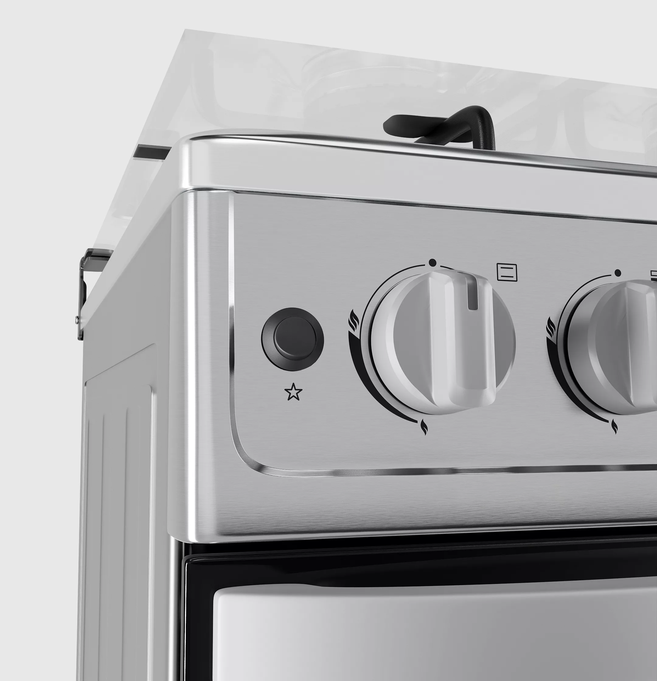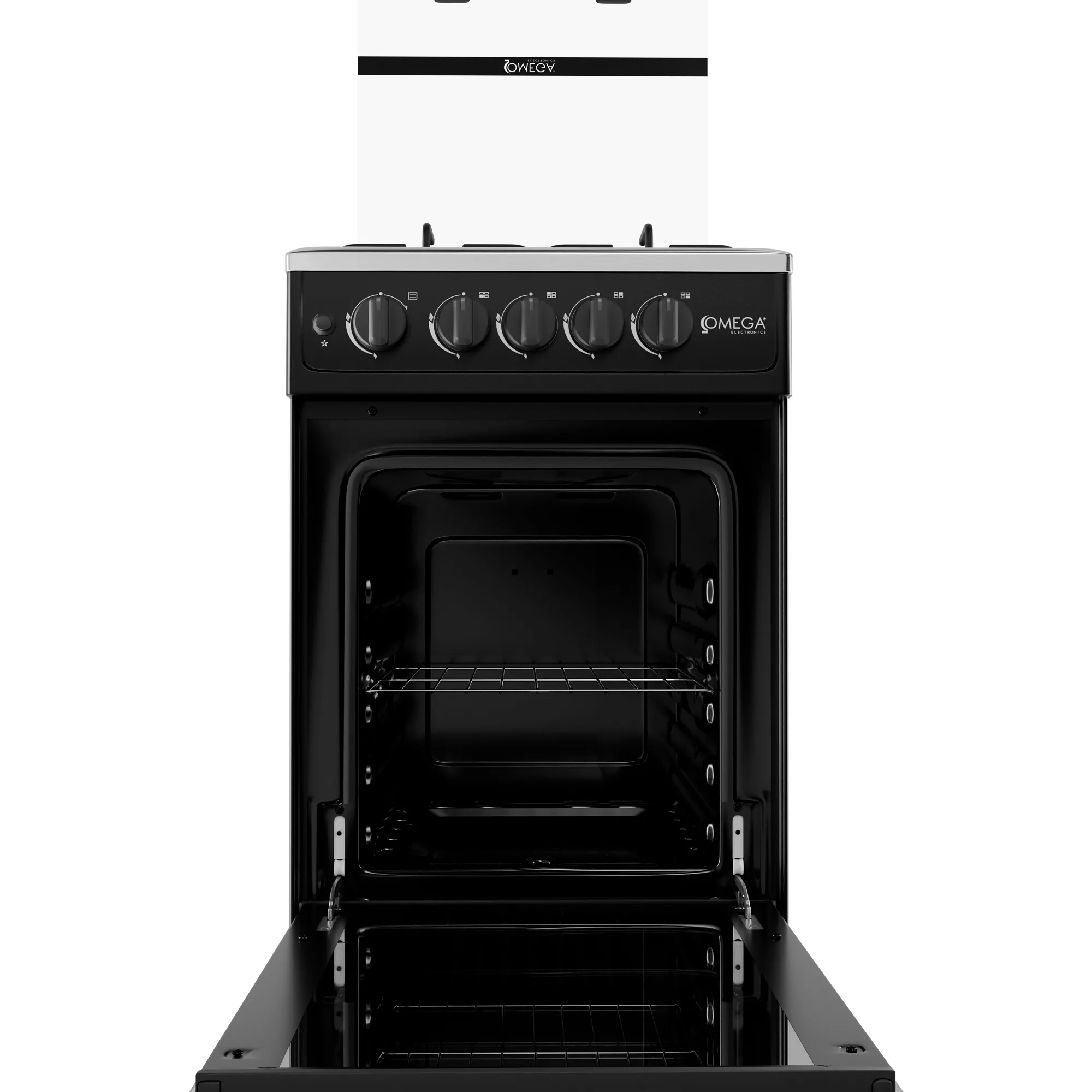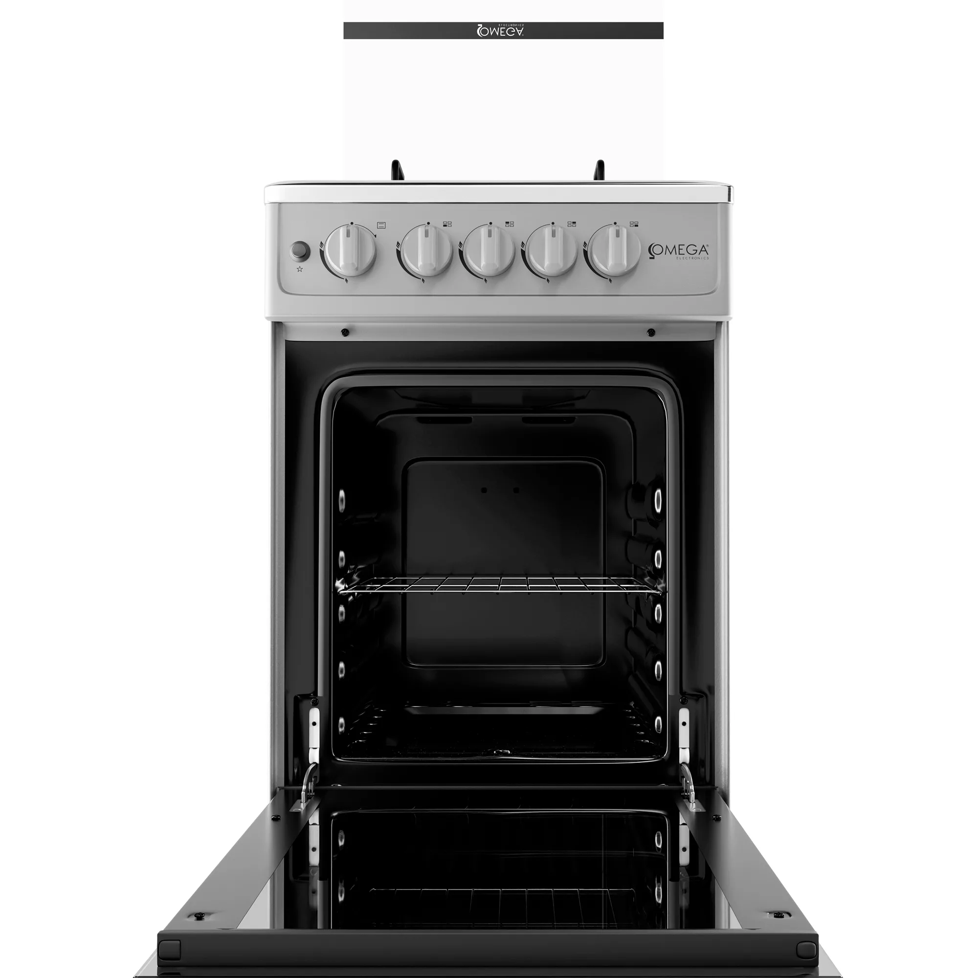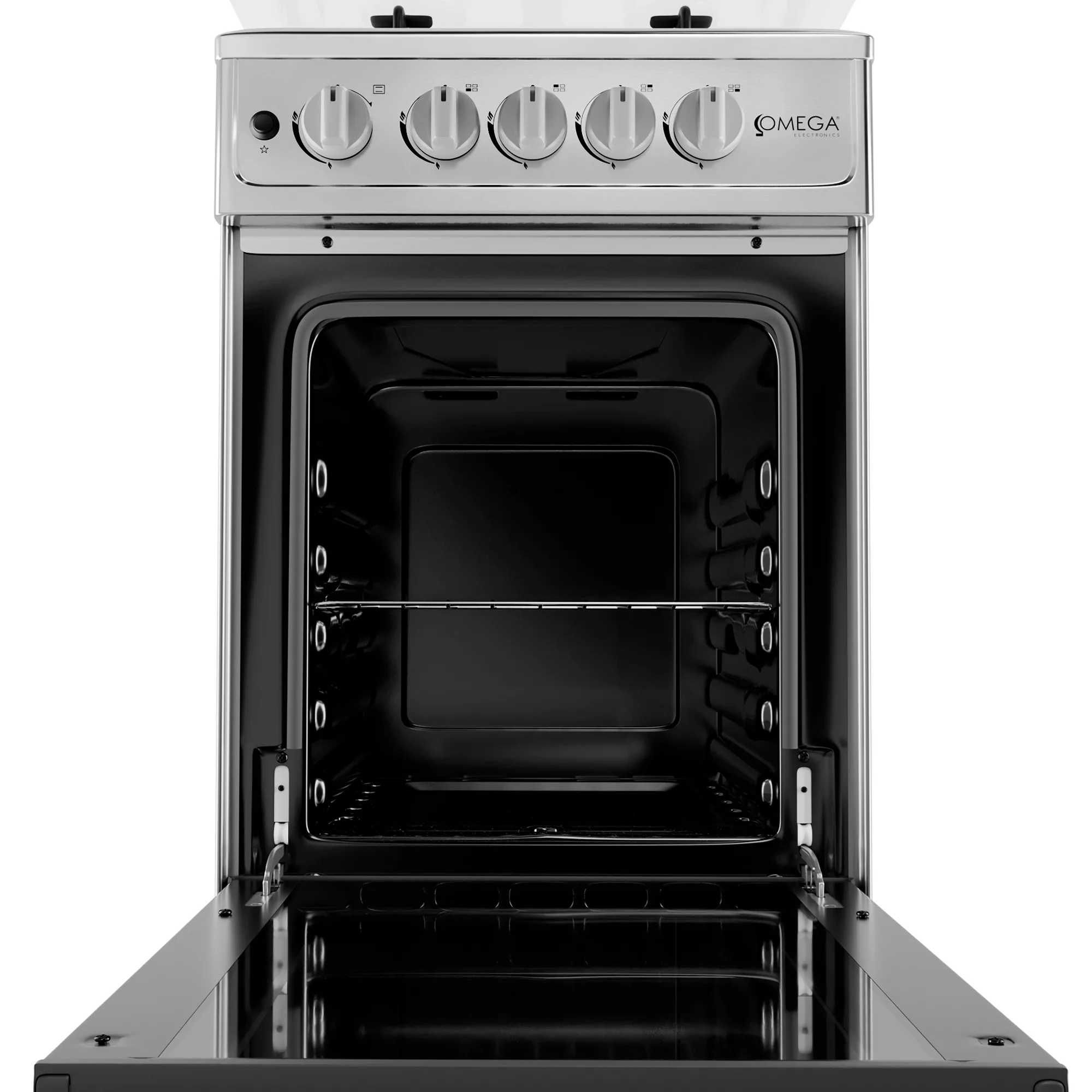 Cocina 20″ con 4 quemadores, soporte de sartén esmaltado mate, encendido eléctrico para hornillas y horno, tapa de vidrio, quemador abierto, perilla de plástico K46, mango de plástico H47, tubo sin rosca (sin conector), 1 rejilla para hornear.