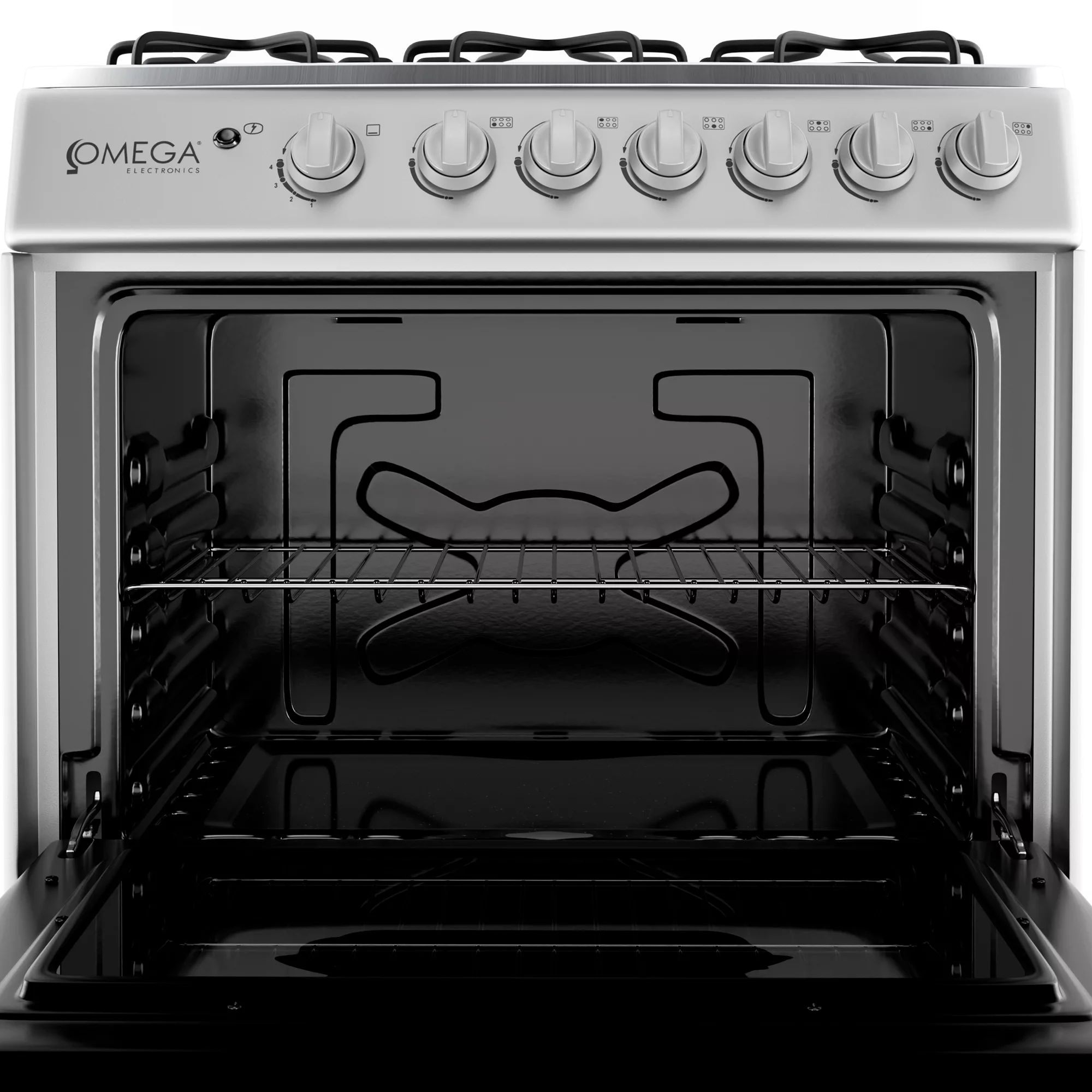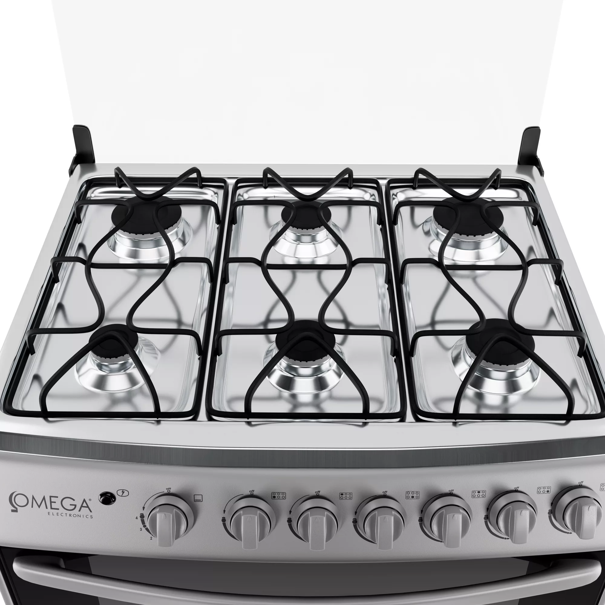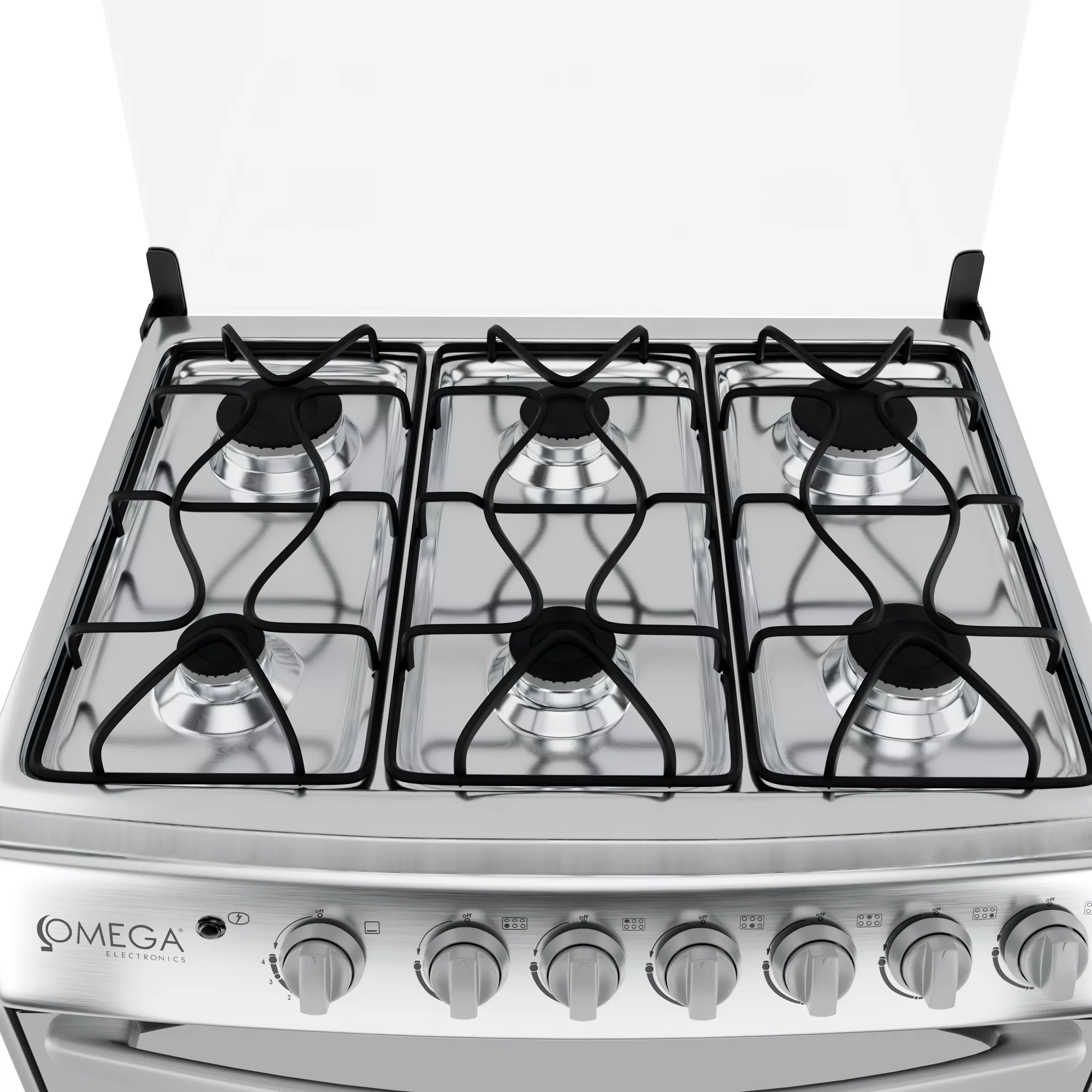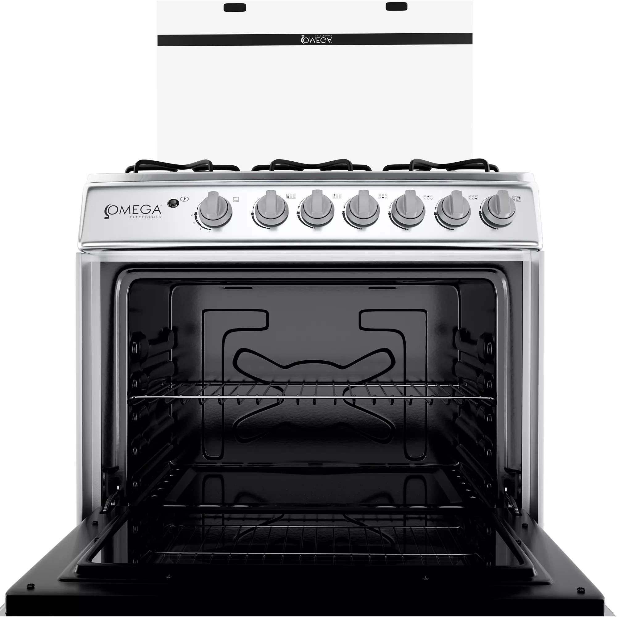 Cocina 30″ con 6 quemadores, frente de acero inoxidable + lados plateados, soporte de sartén esmaltado mate, encendido eléctrico para hornillas y horno, tapa de vidrio, quemador abierto, perilla de plástico, manija de plástico. Tubo sin rosca (sin conector), 90 cm de altura, 1 rejilla para hornear.